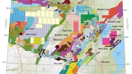 A map outlining claims in the Athabasca basin. The image is from Exploration GIS, a Saskatoon, Sask.-based consulting firm with extensive experience in the basin. The company provides products to the …