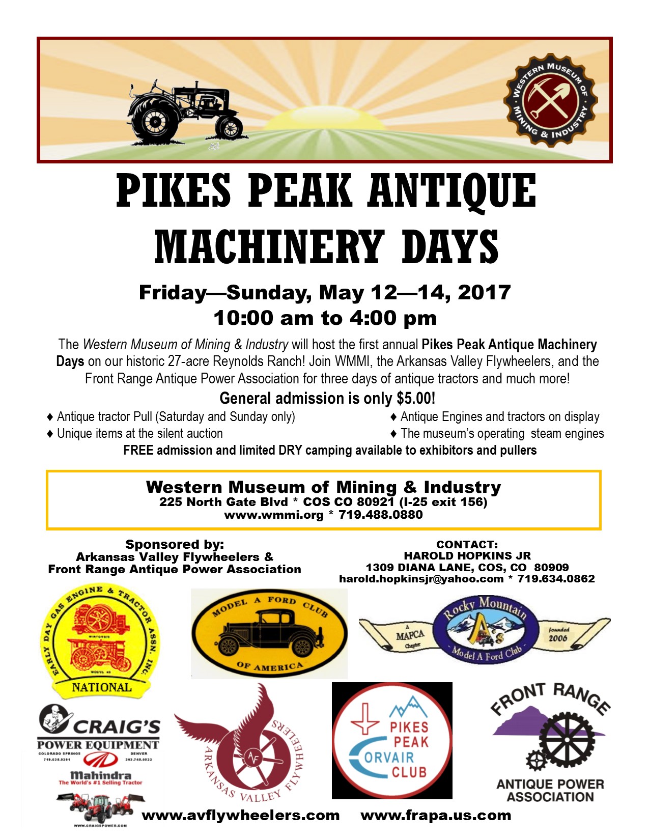 The Western Museum of Mining & Industry will host the first annual Pikes Peak Antique Machinery Days on our historic 27- acre Reynolds Ranch! Join WMMI, the Arkansas Valley Flywheelers, Front Range Antique Power Association, antique automobile clubs, tractor pulls, and more!