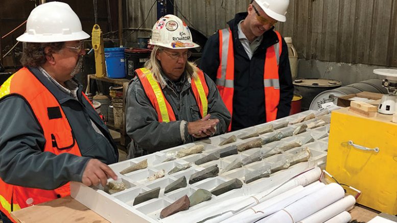 In the core shack at Integra Resources’ DeLamar gold property in southwestern Idaho, from left: Tim Arnold, vice-president of project development; Kim Richardson, project consultant and former mine superintendent; and Stephen de Jong, chairman. Credit: Integra Resources.