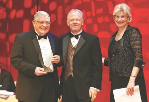 There are two recipients of this year’s Distinguished Service Award from the Prospectors and Developers Association of Canada, which was handed out at the PDAC awards night in March. Top: Donald Mustard, former head of BP Minerals is given the award by PDAC organizing committee chair Rodney Thomas and outgoing PDAC president Pat Dillon. Bottom: Maureen Jensen, president and CEO of Market Regulation Services, is given the award by PDAC executive director Tony Andrews.
