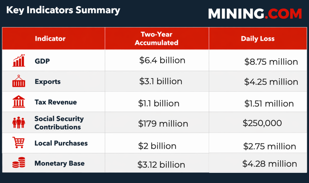 National growth slowed from 7.4% in 2023 to 2.9% in 2024, while export losses reached roughly $2 billion. Government revenue tied to corporate taxes, royalties and related payments has also fallen sharply, straining public finances and limiting spending on infrastructure and social programs.