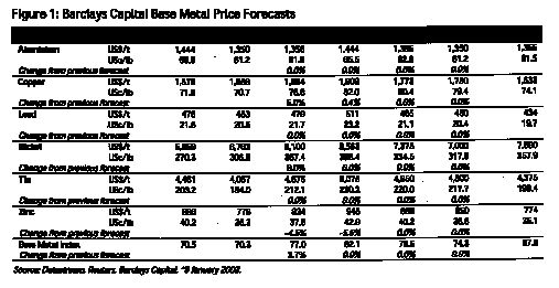The other main change is a downward revision to our estimated rise in zinc prices for the period 2003-04, as we believe the supply-side structure will hamper our previous optimistic forecast. On an aggregate basis, we expect a price rise of 10% this year, following a 0.3% drop in 2002.