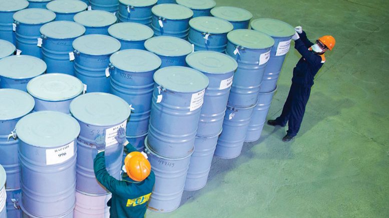 Uranium drums at Cameco’s 83%-owned Key Lake uranium mill in 2014. Credit: Cameco.