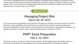 This 2-day course explores quantitative and qualitative techniques to identify and analyze project risk factors (risk event, event probability, and event impact). A variety of risk response choices are discussed,…